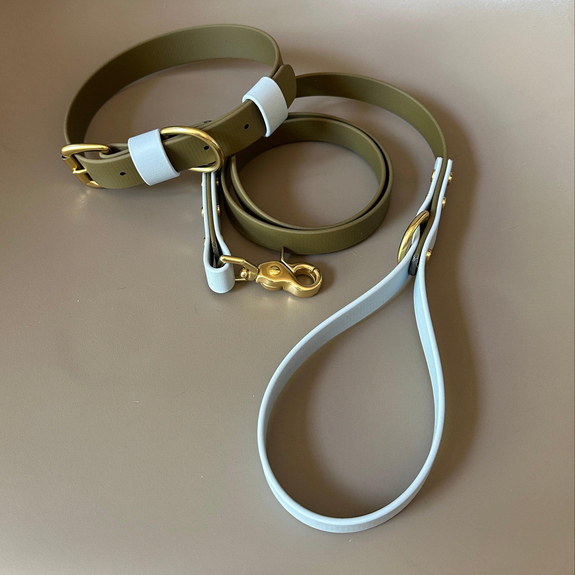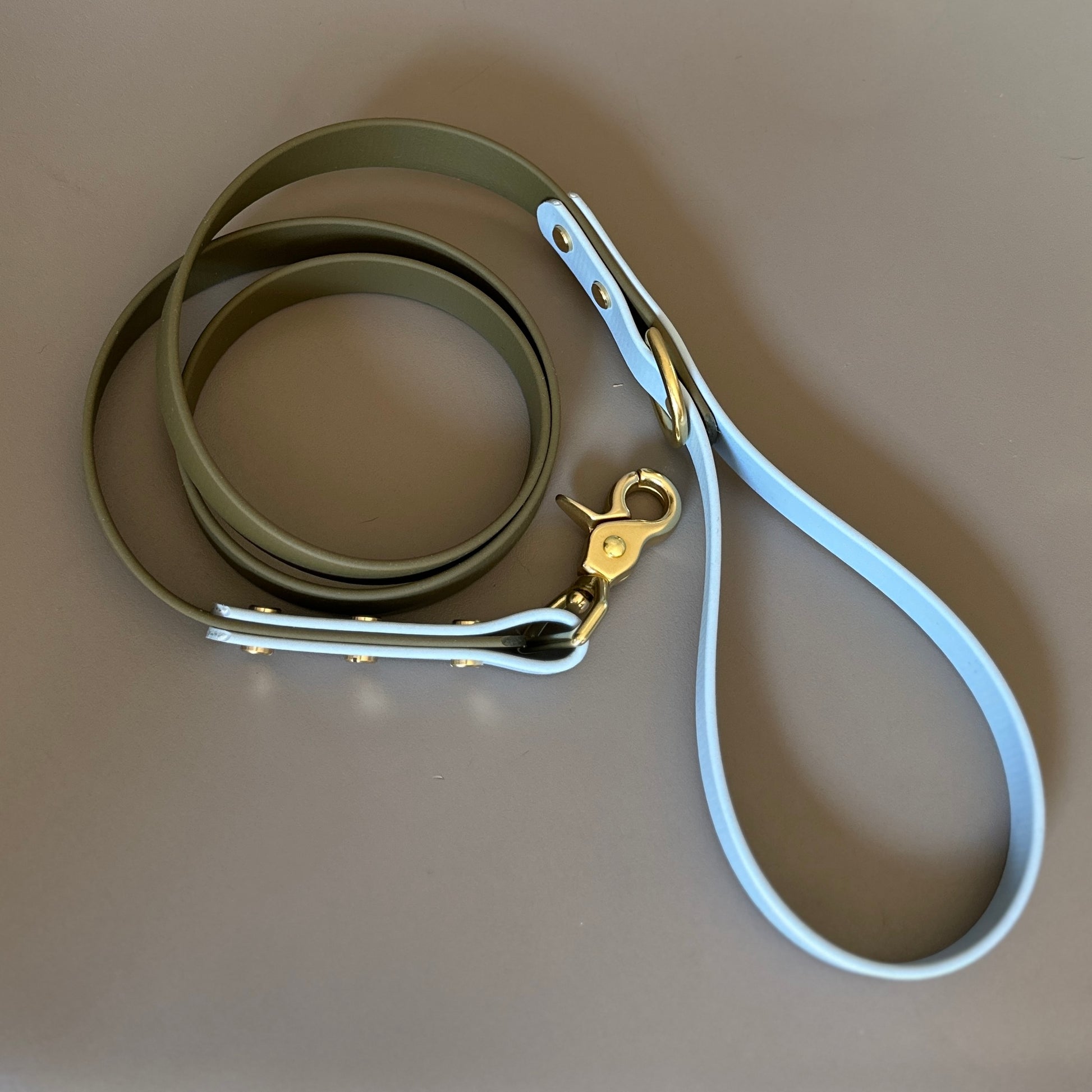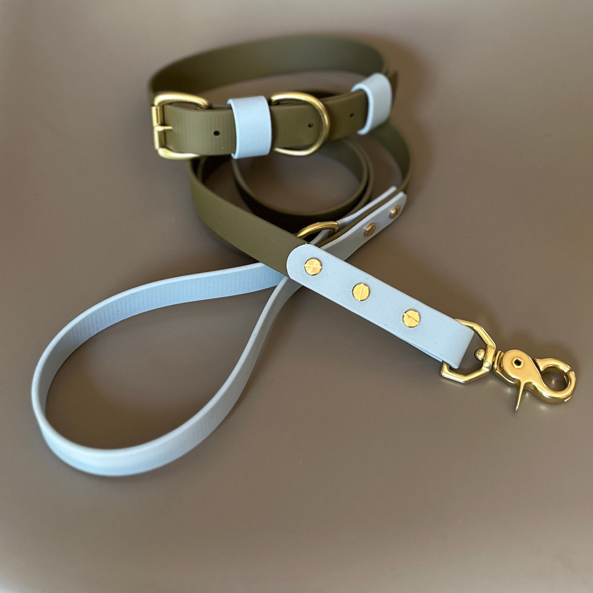 Our Olive as the main colour with a highlight of Powder Blue. Designed & worn by handsome customer Rupert the German Pointer.