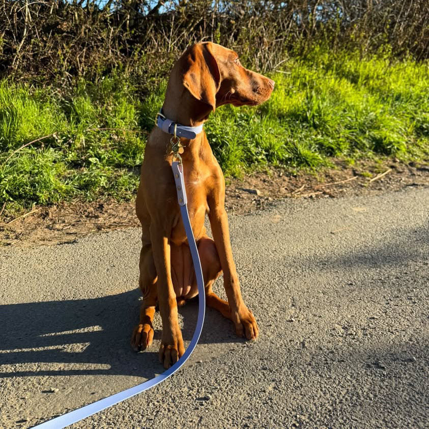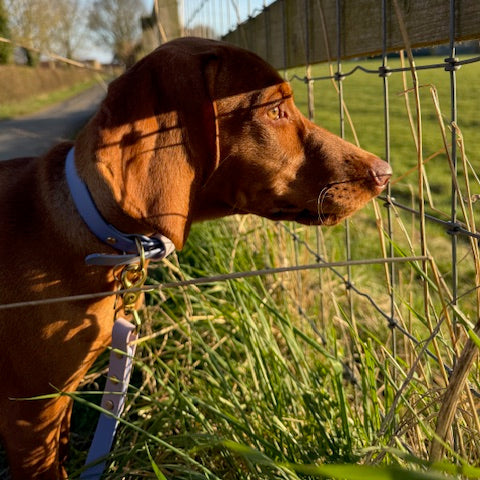 Our handmade collars and leads are made of BioThane®, a very strong rubber coated webbing that has a soft pliable leather like look and feel. BioThane® is water resistant, mould resistant, odour resistant, anti-bacterial and easy to keep clean. The ideal material for any active pup, especially if your dog likes a swim or gets very dirty during their walks, simply wipe it clean afterwards and it will be as good as new.