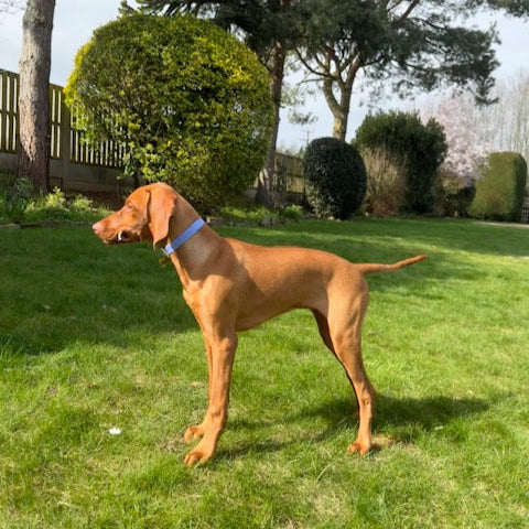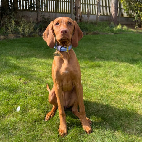 Our Bluebell as the main colour with a highlight of Lavender on the keeper. Designed & worn by cute customer Shelby the Hungarian Vizsla.