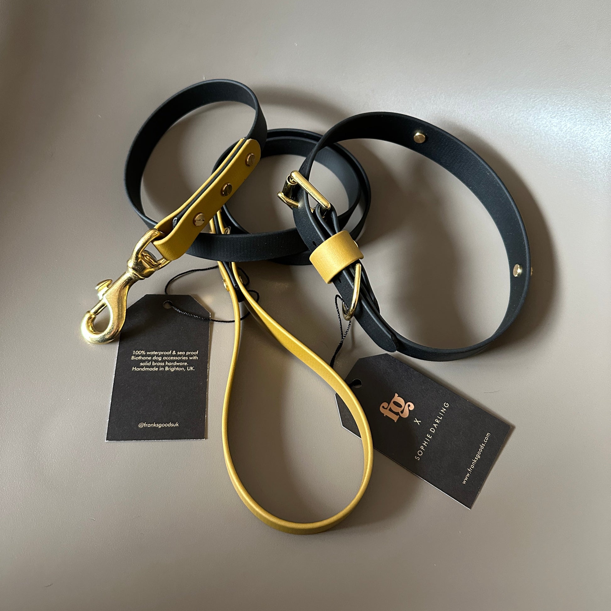 Our classic Black is the main colour of this collar with beautiful highlights of Gold on the keeper and also across the back band which is visible from above when worn. This collar and the matching lead have been designed for and are worn by Sophie's dog Frida the Vizsla and our very own Frank.