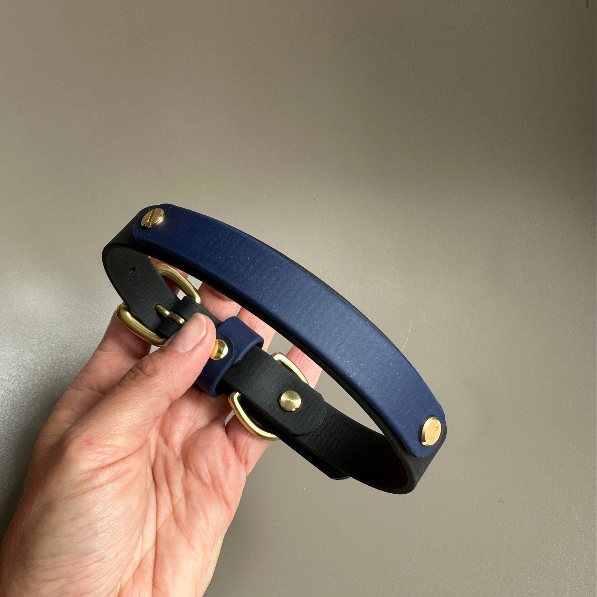 Our Black as the main colour with a highlight of Cobalt navy blue on the keeper and band. Designed & worn by handsome customer Squigg the Staffy X Jack Russel.