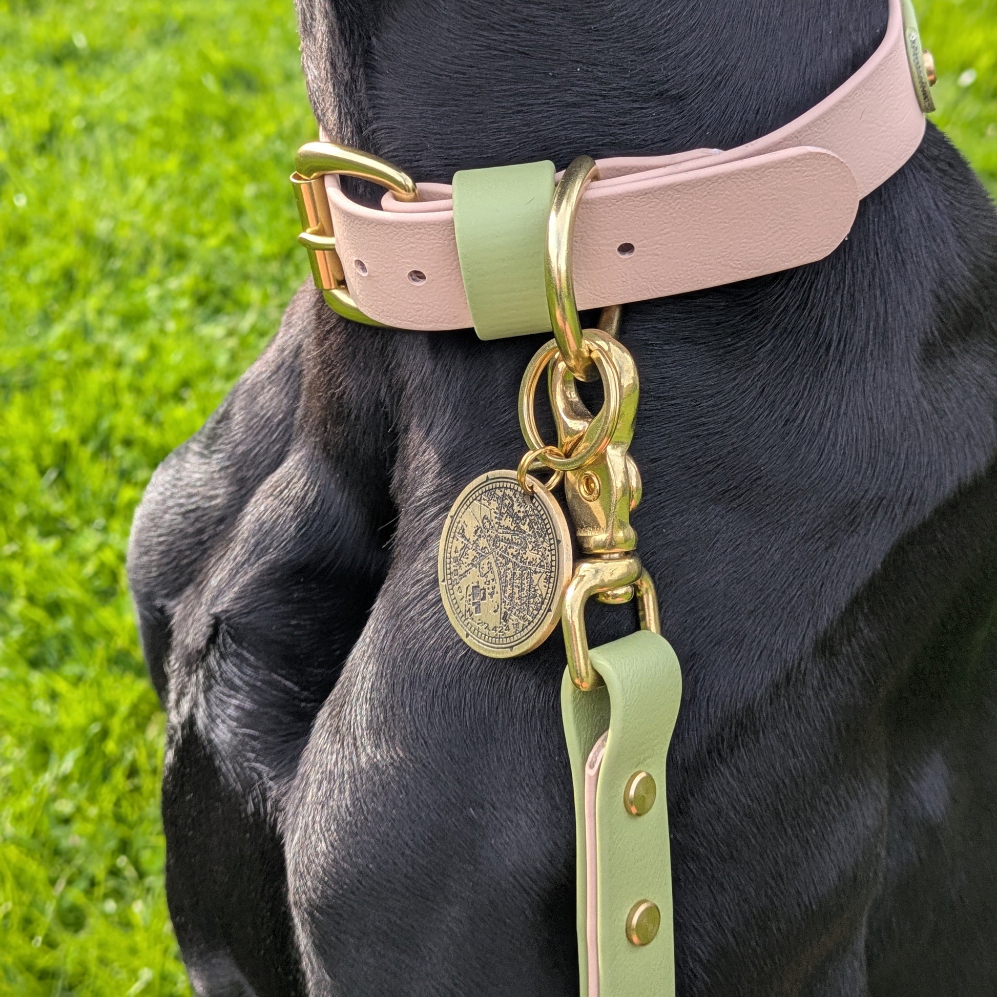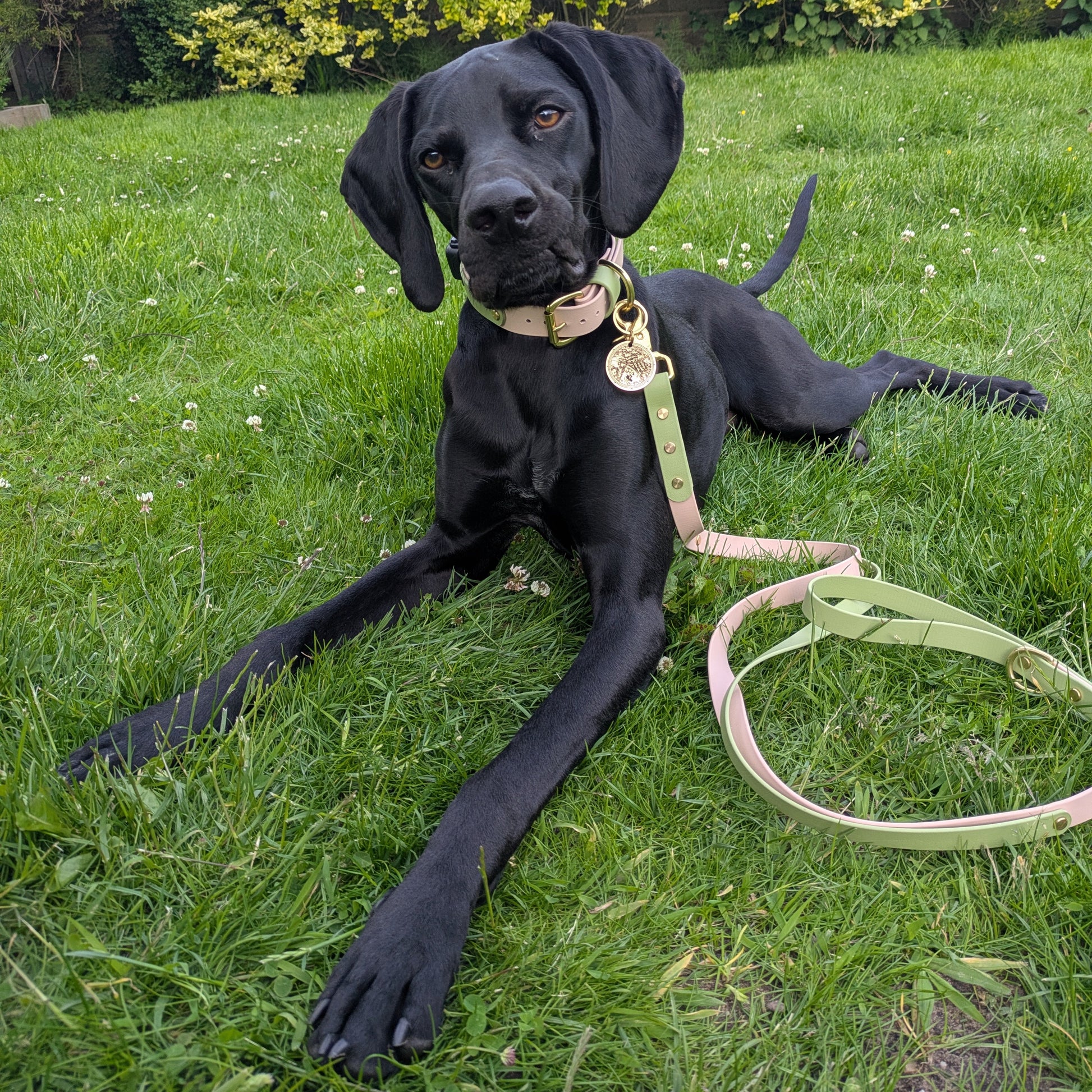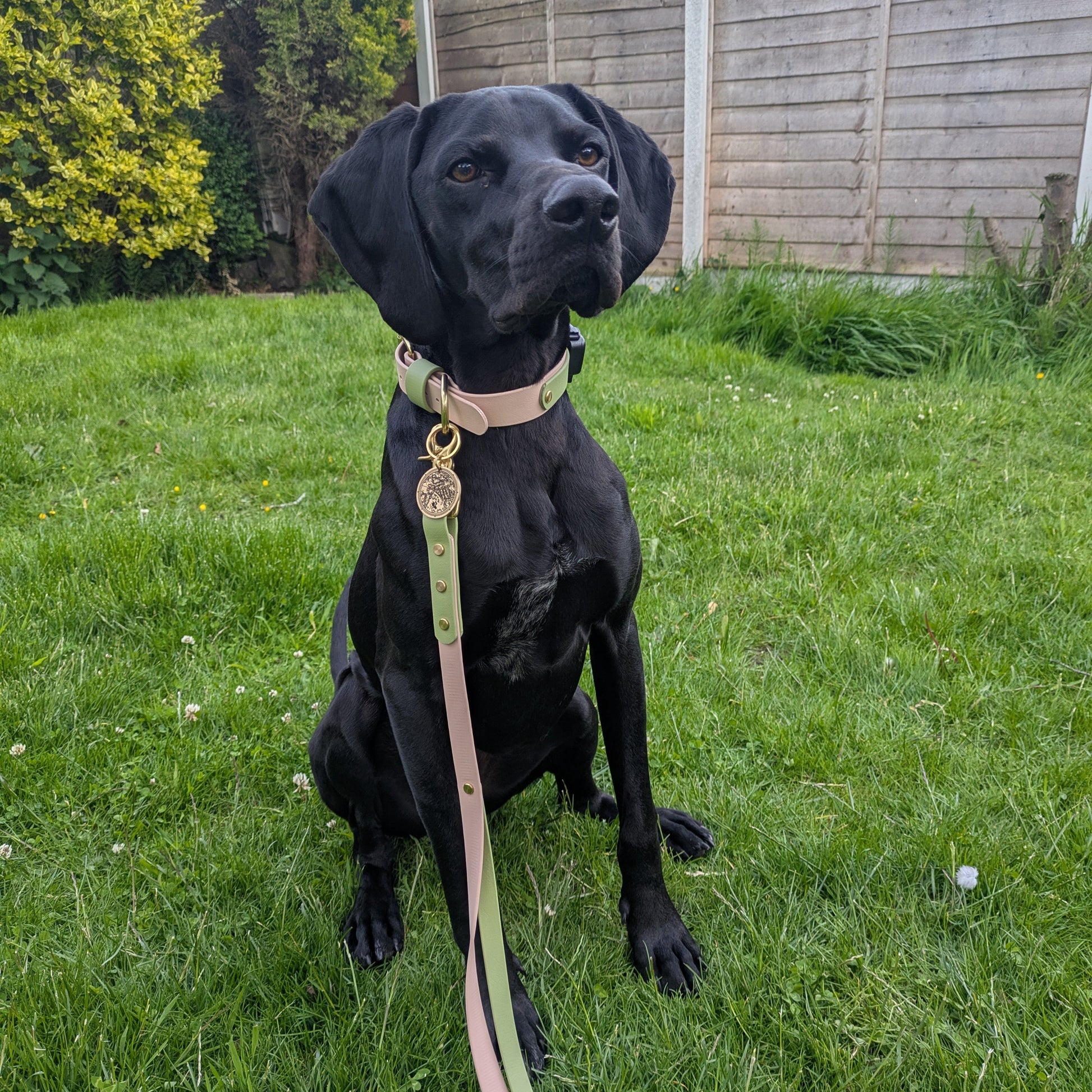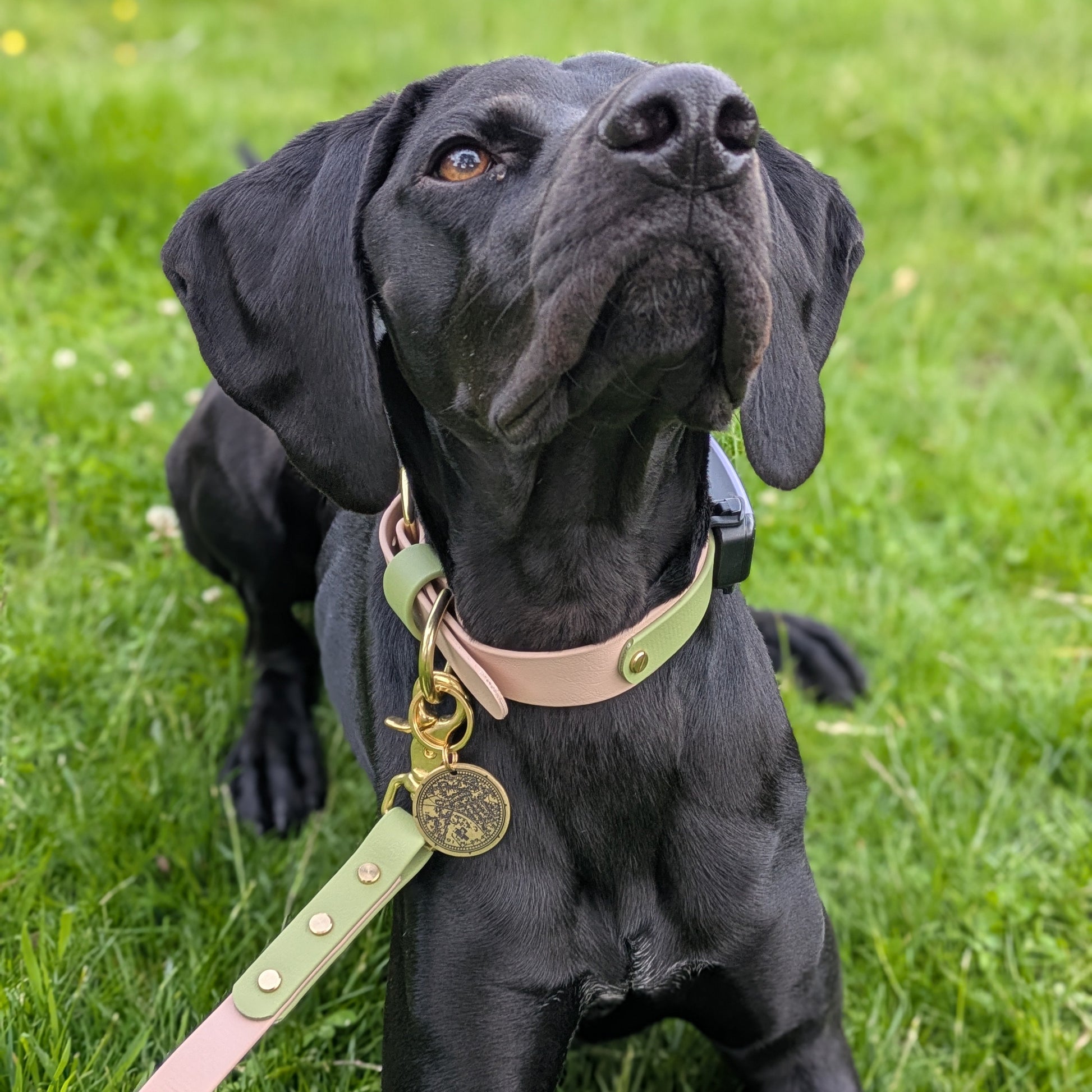 Our handmade collars and leads are made of BioThane®, a very strong rubber coated webbing that has a soft pliable leather like look and feel. BioThane® is water resistant, mould resistant, odour resistant, anti-bacterial and easy to keep clean. The ideal material for any active pup, especially if your dog likes a swim or gets very dirty during their walks, simply wipe it clean afterwards and it will be as good as new.