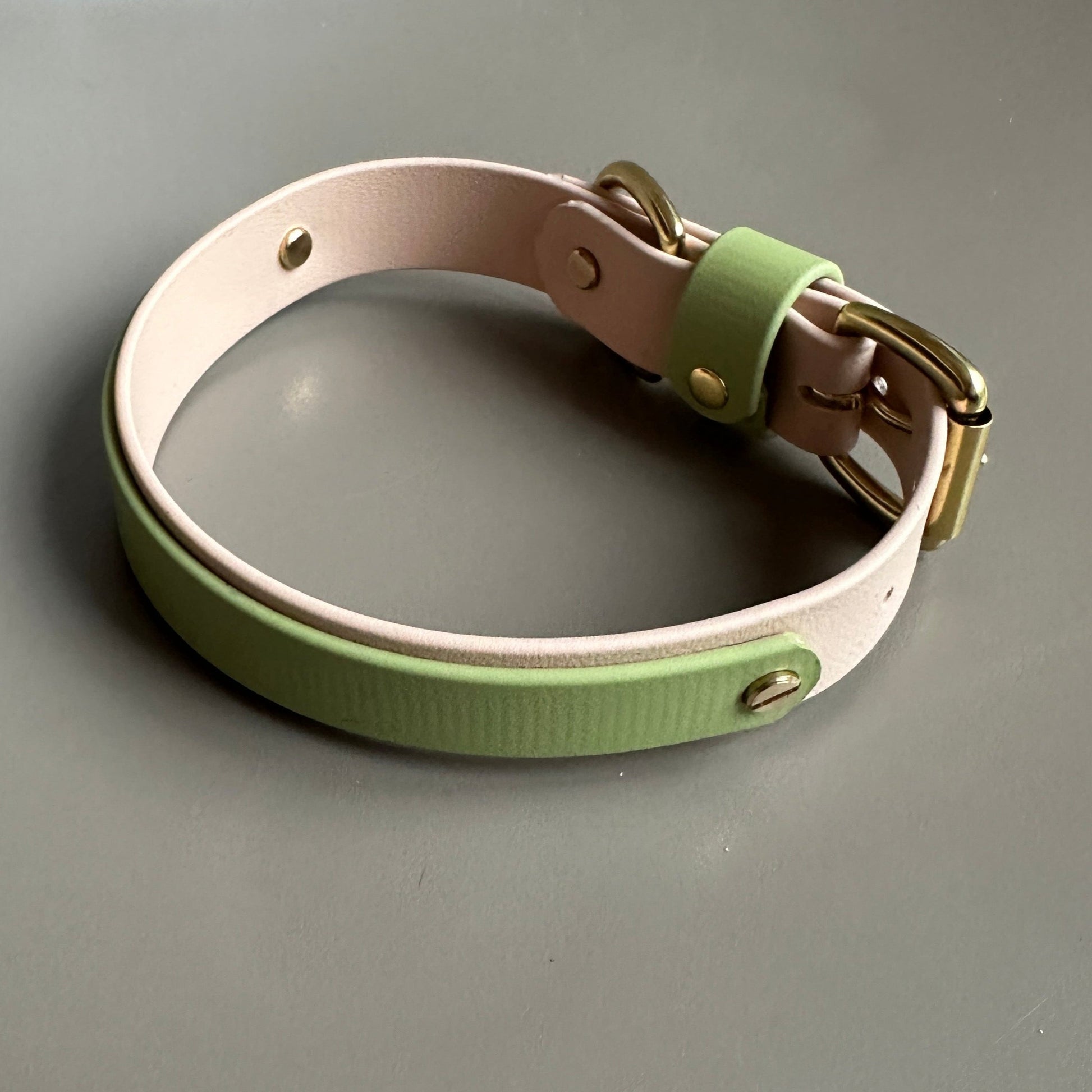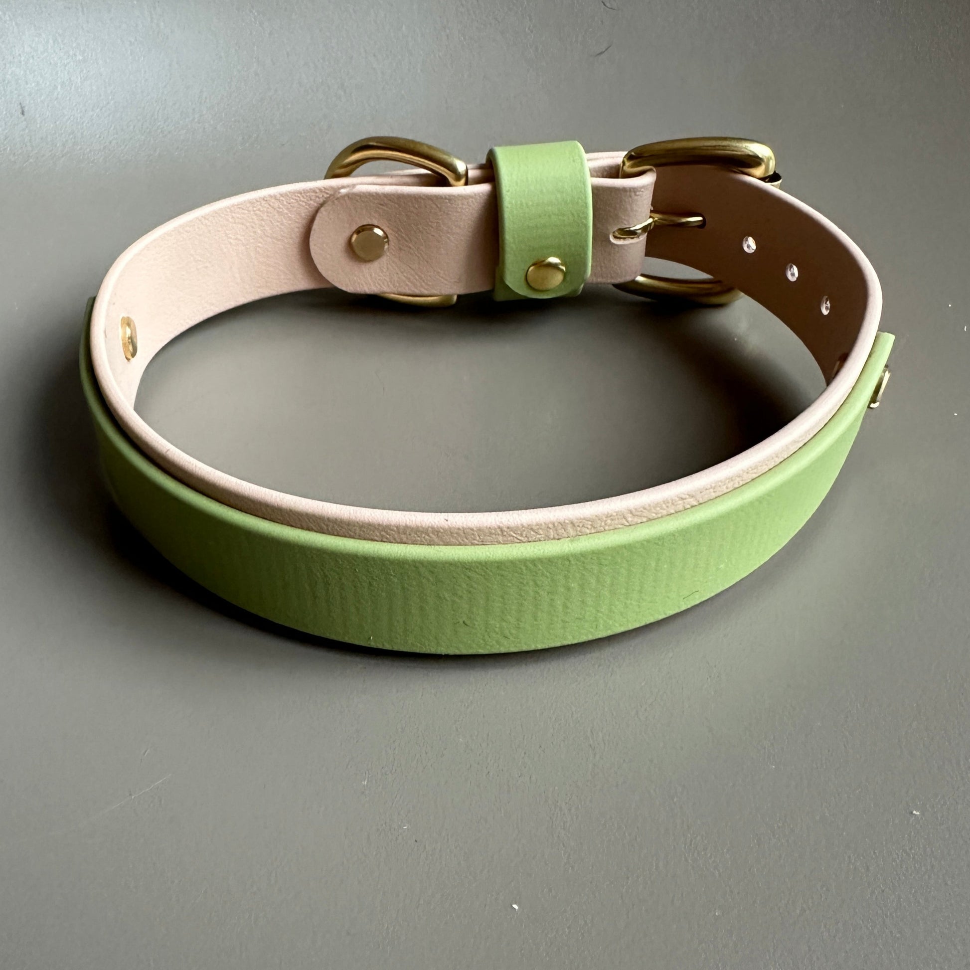 Our Latte as the main colour with a highlight of Guacamole on the keeper and band. Designed & worn by handsome customer Loki the German Pointer X from Tecuci, Romania.