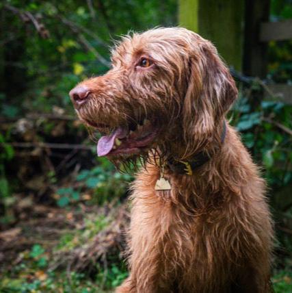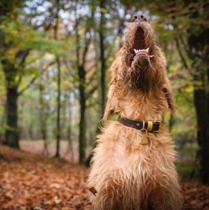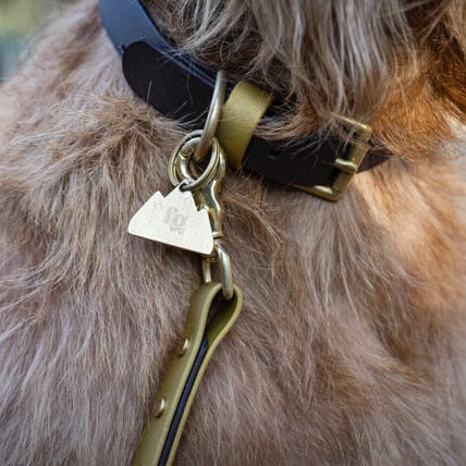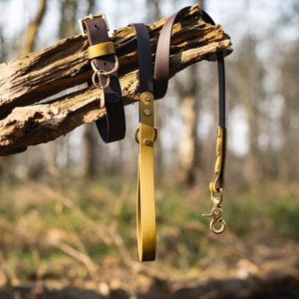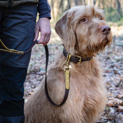 Our Dark Brown as the main colour with a highlight of Gold on the keeper. Designed & worn by handsome customer Vini the Wirehaired Vizsla.